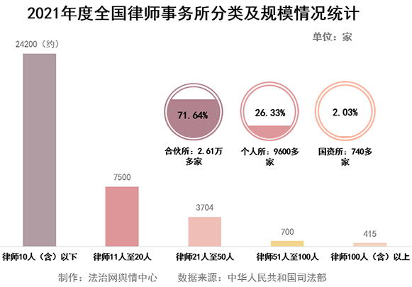 從律所規(guī)模上看,“10人及以下”律所最多,達(dá)2.42萬(wàn)家,“11人至20人”律所次之,達(dá)7500家?!?00人及以上”的大型律所共有415家。