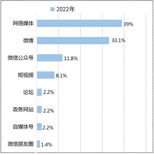 2022年,網(wǎng)絡(luò)媒體與微博仍為政法輿情最主要的“策源地”,自兩平臺(tái)發(fā)酵的輿情數(shù)量已超過(guò)七成,其中網(wǎng)絡(luò)媒體占比達(dá)39%,居于首位。一般情況下,網(wǎng)民發(fā)布爆料內(nèi)容后引發(fā)關(guān)注,媒體進(jìn)而追蹤報(bào)道,助推輿情走高。發(fā)酵于微信公眾號(hào)的輿情數(shù)量居第三位,相關(guān)輿情內(nèi)容多為政法機(jī)關(guān)新媒體宣傳案例及自媒體爆料。例如山東高法官方微信文章稱不能僅以出軌為由請(qǐng)求離婚、廣州司法局官微虛構(gòu)故事情節(jié)進(jìn)行普法等事件均引發(fā)輿論熱議,相關(guān)微博話題閱讀量超數(shù)億人次,可見(jiàn)政法機(jī)關(guān)新媒體作為宣傳主陣地,其隱含的輿情價(jià)值與潛藏的輿情風(fēng)險(xiǎn)同樣不可忽視。來(lái)源于短視頻平臺(tái)的輿情占比8.1%,包括四川網(wǎng)紅博主食用瀕危大白鯊案、蘇州淮海路步行街女子因穿和服被警方帶走事件等。發(fā)酵自政務(wù)網(wǎng)站、論壇、自媒體號(hào)、微信朋友圈的輿情占比合計(jì)8%,其中來(lái)源于政務(wù)網(wǎng)站的輿情多為法院判決爭(zhēng)議案件。