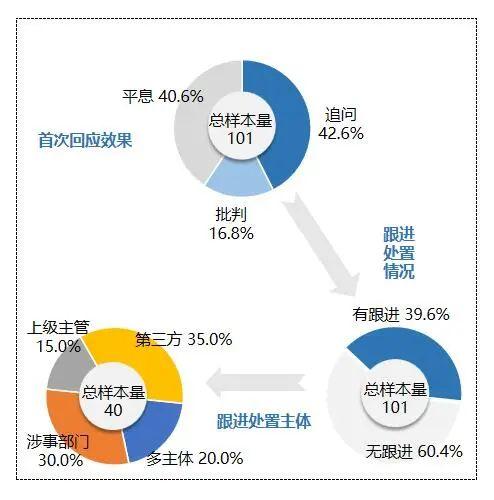 從后續(xù)處置情況來(lái)看,跟進(jìn)處置工作能夠有效消除質(zhì)疑,降溫輿情。這類案例共40起,其中約四成案例是在輿情平息后相關(guān)部門依法按照職責(zé)和程序進(jìn)行處理,如江蘇南京男子上門掌摑幼童事件中,警方刑拘打人者后檢方依法提前介入辦案。有六成是在引起追問(wèn)和批評(píng)后跟進(jìn)處置。典型案例如在哈爾濱男子燒傷死亡一案中,警方首次回應(yīng)細(xì)節(jié)不足,結(jié)論簡(jiǎn)單,因此備受網(wǎng)民質(zhì)疑。隨后當(dāng)?shù)爻闪⒄{(diào)查組,用證據(jù)和事實(shí)還原真相,有力回?fù)糁{言。在跟進(jìn)處理的主體方面,由涉事部門作為主體的案例有12起,由上級(jí)主管部門回應(yīng)的有6起,由第三方或多部門處理的事件有22起。此外,通過(guò)案例分析還可以看出,在重大輿情應(yīng)對(duì)工作中,隨著輿情態(tài)勢(shì)升級(jí),相關(guān)部門成立聯(lián)合調(diào)查組進(jìn)行深入調(diào)查處理的情況較為常見(jiàn),如江蘇“豐縣生育八孩女子”事件、河南杞縣“坂木殺人案”死者家屬實(shí)名舉報(bào)事件等。