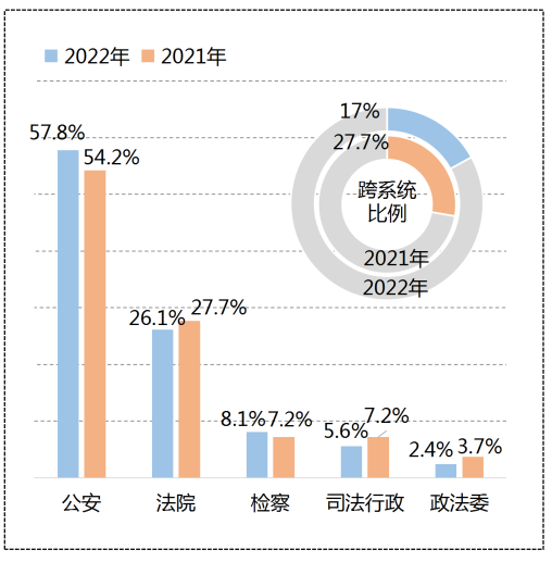 從系統(tǒng)分布來(lái)看,公安系統(tǒng)輿情數(shù)量居首位,占比近六成,與2021年的數(shù)據(jù)相近。一方面,本年度特別重大、重大公共安全事故多發(fā),包括東航MU5735航空器飛行事故、湖南長(zhǎng)沙自建房倒塌事故、河南安陽(yáng)火災(zāi)事故等;另一方面,刑事案件發(fā)生率較高,占公安系統(tǒng)輿情比重過(guò)半,包括江西安福幼兒園命案、安徽靈璧縣漁溝中學(xué)學(xué)生死亡案等。在個(gè)別性質(zhì)惡劣的案件中,公安機(jī)關(guān)執(zhí)法水平、速度與方式遭受質(zhì)疑。法院系統(tǒng)輿情占比26.1%,居于第二位,其中判罰爭(zhēng)議為最主要輿情類型。檢察院、司法行政、政法委等領(lǐng)域輿情均較低??缦到y(tǒng)輿情占比17%,較2021年下降幅度較大,關(guān)注度較高的案件有河北唐山“燒烤店打人案”、南京女大學(xué)生被害案、劉學(xué)州自殺案等,覆蓋公檢法等多個(gè)系統(tǒng)。