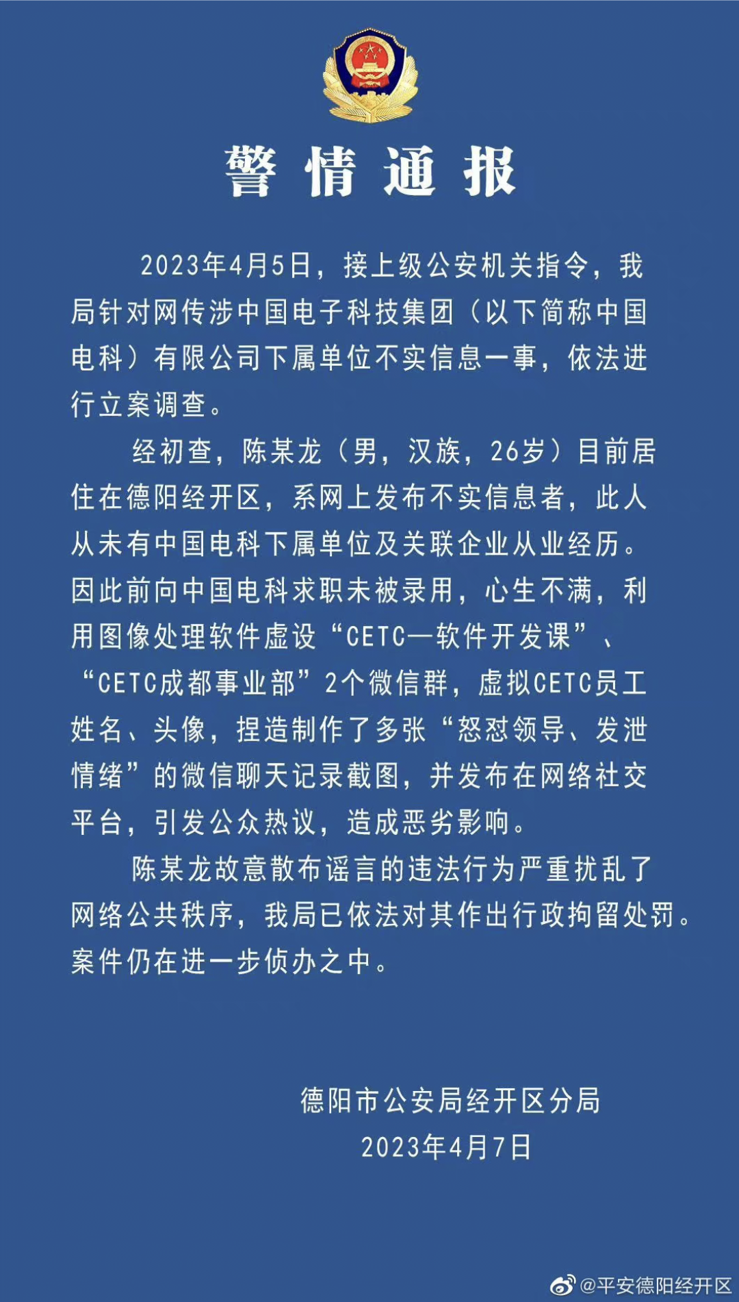 4月7日,大皖新聞報(bào)道稱,網(wǎng)傳加班事件當(dāng)事人陳志龍為四川省德陽(yáng)市經(jīng)開區(qū)某科技公司員工,德陽(yáng)市人社局辦公室也回應(yīng)稱“正在進(jìn)行調(diào)查”。4月7日晚間,四川省德陽(yáng)市公安局經(jīng)開區(qū)分局通過(guò)官方微博發(fā)布警方通報(bào)稱,陳某龍從未有中國(guó)電科下屬單位及關(guān)聯(lián)企業(yè)從業(yè)經(jīng)歷,其因此前向中國(guó)電科求職未被錄用,心生不滿,利用圖像處理軟件虛設(shè)“CETC—軟件開發(fā)課”“CETC成都事業(yè)部”2個(gè)微信群,虛擬CETC員工姓名、頭像,捏造制作了多張“怒懟領(lǐng)導(dǎo)、發(fā)泄情緒”的微信聊天記錄截圖,并發(fā)布在網(wǎng)絡(luò)社交平臺(tái),造成惡劣影響。目前陳某龍已被警方行政拘留。4月8日,微博平臺(tái)官方表示,已清理此事件中散布不實(shí)信息、惡意攻擊國(guó)企體制的違規(guī)內(nèi)容5792條,并對(duì)“@老c隊(duì)長(zhǎng)”等9個(gè)違規(guī)“自媒體”賬號(hào)及253個(gè)違規(guī)用戶予以禁言處置。
