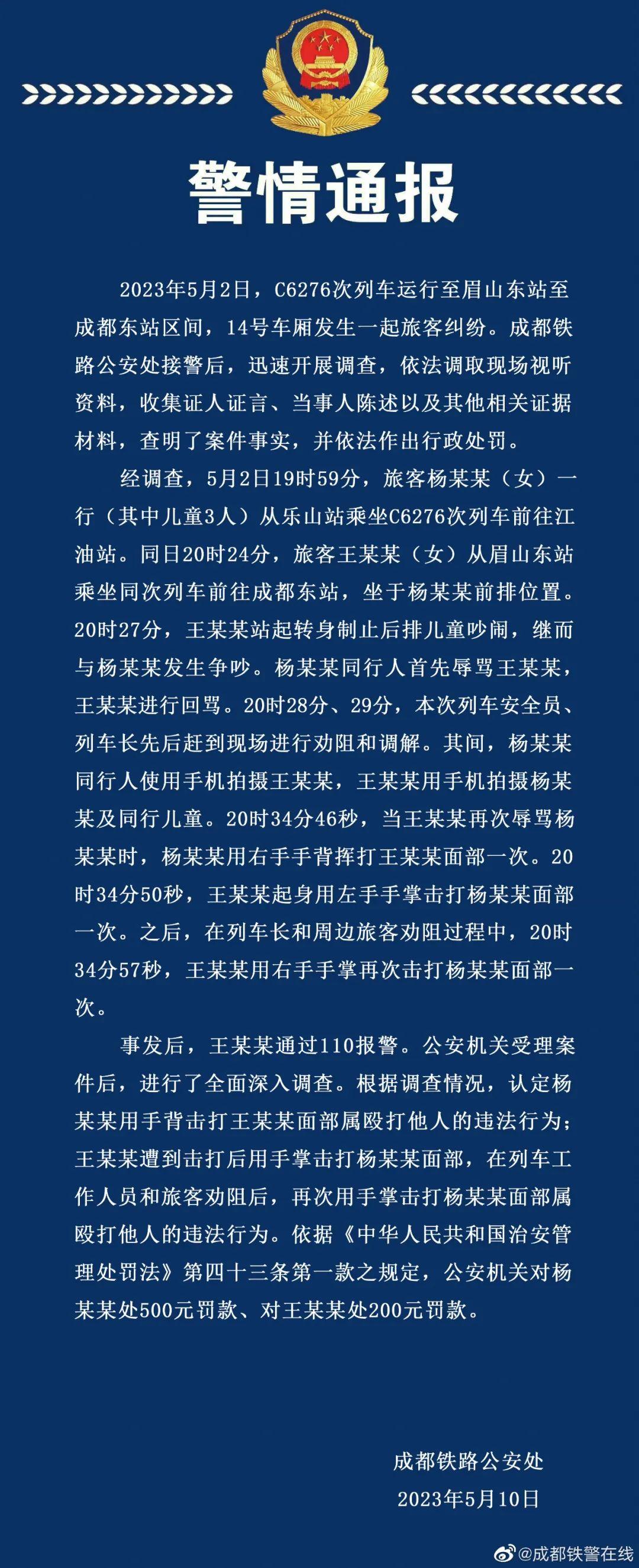 面對網(wǎng)絡(luò)質(zhì)疑,5月10日,成都鐵路公安處官方微博“@成都鐵警在線”發(fā)布警情通報(bào)稱,根據(jù)調(diào)查情況,認(rèn)定楊某某用手背擊打王某某面部屬毆打他人的違法行為;王某某遭到擊打后用手掌擊打楊某某面部,在列車工作人員和旅客勸阻后,再次用手掌擊打楊某某面部屬毆打他人的違法行為。警方據(jù)此認(rèn)為雙方均違反治安管理處罰法,并處以不同金額的罰款。隨后,四川廣播電視臺(tái)“@四川觀察”、封面新聞公布現(xiàn)場視頻,涉及列車車廂監(jiān)控、列車長巡檢記錄儀、當(dāng)事雙方手機(jī)所拍視頻等多個(gè)角度,直觀地呈現(xiàn)雙方發(fā)生爭執(zhí)繼而爆發(fā)肢體沖突的過程。網(wǎng)絡(luò)討論熱度再次攀升,微博上形成“#高鐵掌摑事件雙方曾多次對罵#”“#高鐵被打女子2次打人被認(rèn)定違法#”“#王某某被打后兩次掌摑楊某某#”等多個(gè)話題,不少網(wǎng)民一改之前支持王某某的立場。但部分網(wǎng)民仍從情感角度出發(fā),質(zhì)疑官方對視頻進(jìn)行二次剪輯,認(rèn)為警方苛求被打者還擊的間隔時(shí)間有失公平。