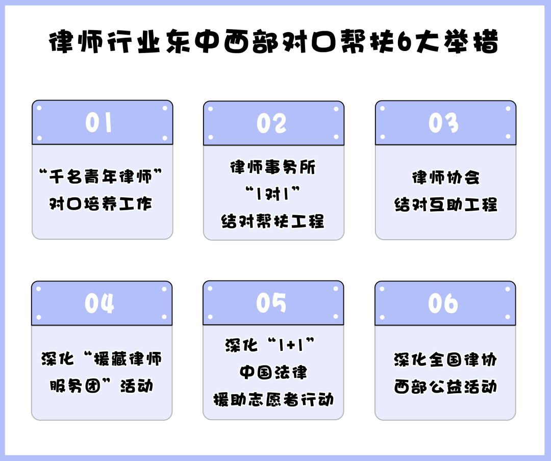 為有效推進律師行業(yè)東中西部對口幫扶工作,《關于建立健全律師行業(yè)東中西部對口幫扶機制的方案》列舉了如下措施。