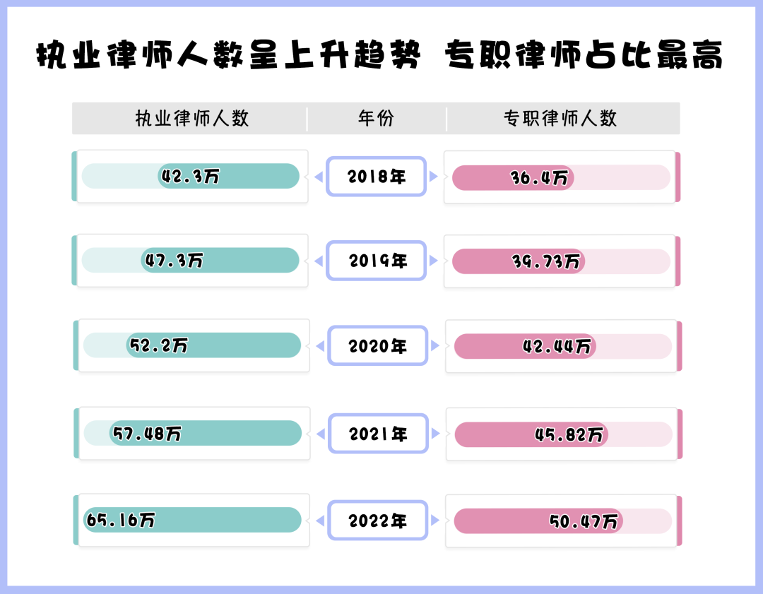 據(jù)司法部發(fā)布的官方數(shù)據(jù)顯示,截至2022年底,全國執(zhí)業(yè)律師已達65.16萬多人,全國律師事務所數(shù)量已經(jīng)增長至3.86萬家,我國律師隊伍不斷壯大。