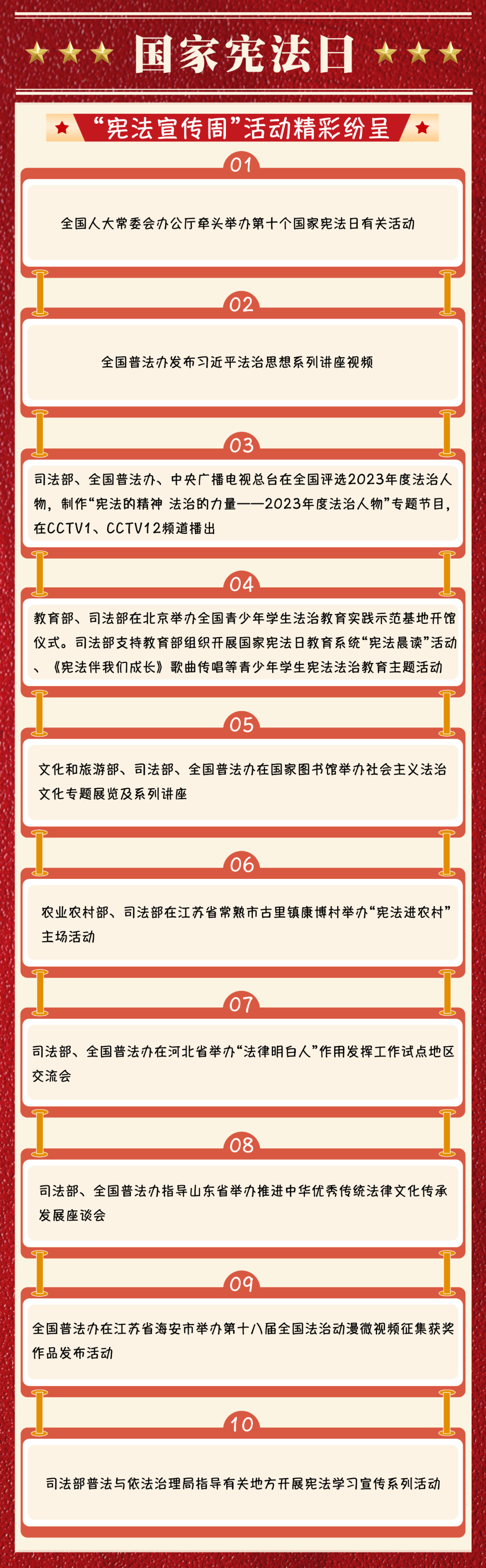 北京市舉辦2023年法治文藝大賽決賽和展演活動(dòng);黑龍江省舉辦“尋找最美‘法律明白人’”活動(dòng);上海市舉辦第七屆上海市企業(yè)法務(wù)技能大賽決賽;安徽省舉辦“憲法護(hù)‘三農(nóng)’、法治助振興”憲法宣傳進(jìn)村居活動(dòng);福建省舉辦“蒲公英在普法”主題法治文藝匯演活動(dòng);江西省舉辦“保護(hù)長(zhǎng)江 ‘憲’在行動(dòng)”憲法進(jìn)長(zhǎng)江國(guó)家文化公園主題宣傳活動(dòng);海南省舉辦“與法同行·憲上有約”網(wǎng)上直播普法活動(dòng);貴州省舉辦普通高中學(xué)生成人儀式禮敬憲法活動(dòng)等。