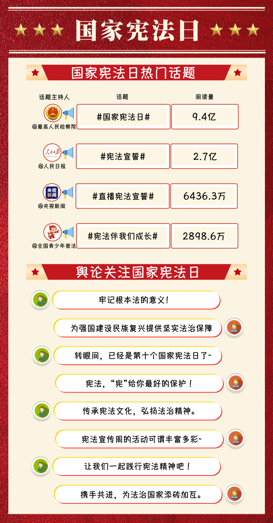 在第十個(gè)國(guó)家憲法日到來(lái)之際,多方積極宣傳相關(guān)信息,形成了多渠道、深層次的傳播格局,為弘揚(yáng)憲法精神創(chuàng)造良好輿論氛圍?!?國(guó)家憲法日#”“#憲法宣誓#”等微博熱門(mén)話題閱讀量分別達(dá)到9.4億余次、2.7億余次?!稗D(zhuǎn)眼間,已經(jīng)是第十個(gè)國(guó)家憲法日了”“傳承憲法文化,弘揚(yáng)法治精神”“攜手共進(jìn),為法治國(guó)家添磚加瓦”等網(wǎng)民留言高居評(píng)論區(qū)前排。