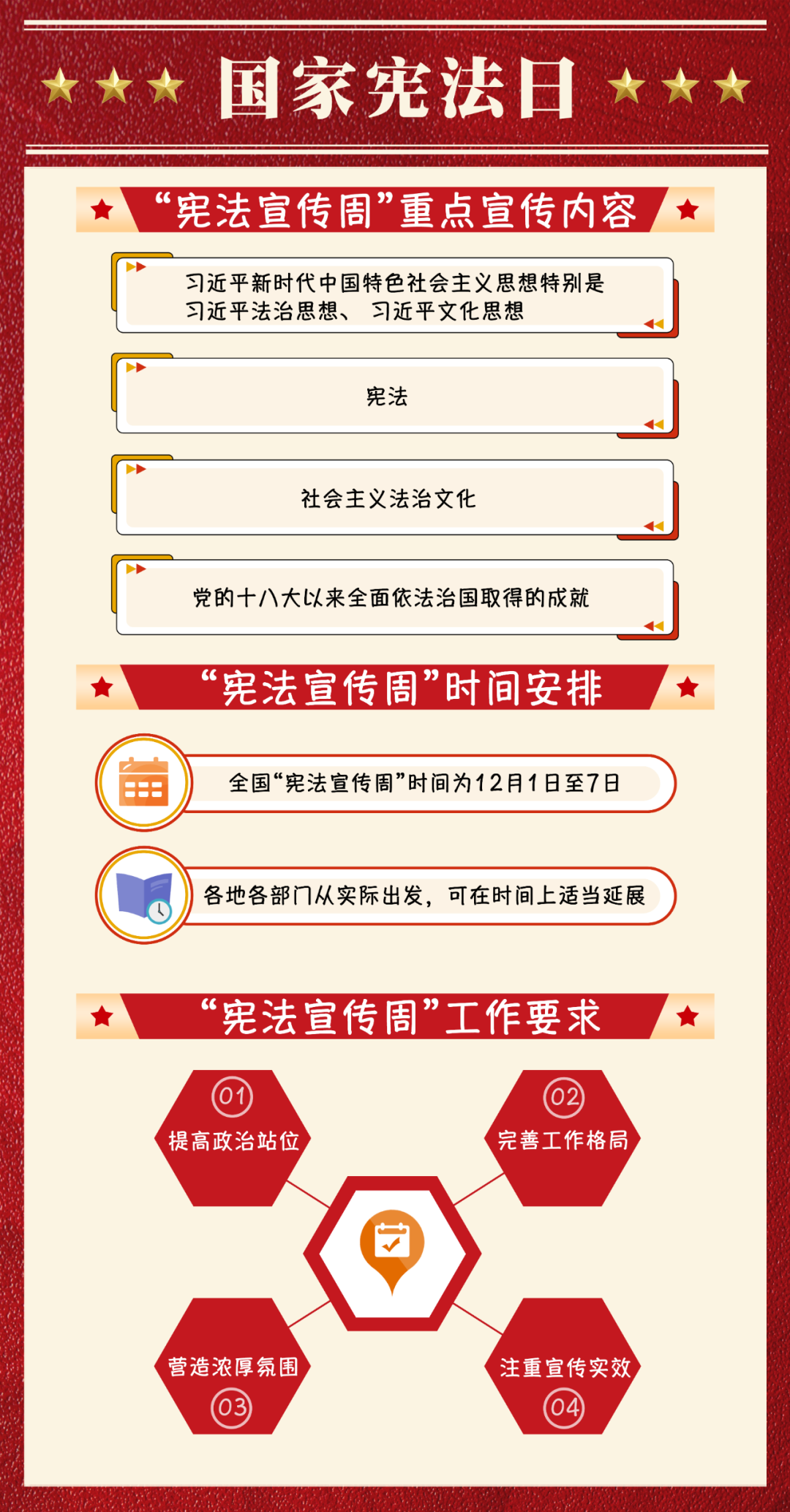 2023年12月4日是第十個(gè)國(guó)家憲法日,12月1日至7日是第六個(gè)“憲法宣傳周”,主題是“大力弘揚(yáng)憲法精神,建設(shè)社會(huì)主義法治文化”。