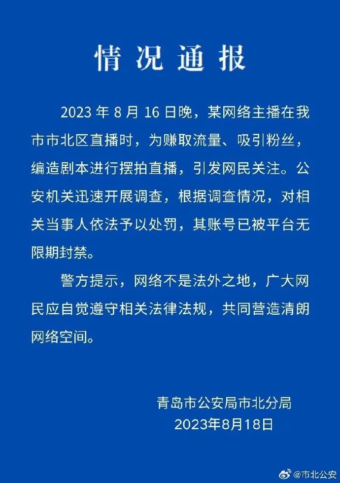 8月18日,青島市公安局市北分局微博賬號(hào)“@市北公安”通報(bào)稱,某網(wǎng)絡(luò)主播在青島市市北區(qū)直播時(shí),為賺取流量、吸引粉絲,編造劇本進(jìn)行擺拍直播。公安機(jī)關(guān)對(duì)相關(guān)當(dāng)事人依法予以處罰,其賬號(hào)已被平臺(tái)無(wú)限期封禁。“#二驢#”“#警方通報(bào)網(wǎng)傳二驢直播被綁架#”等多個(gè)話題閱讀量近6.7億。輿論對(duì)此結(jié)果表示認(rèn)同,評(píng)論稱“山東警方果斷調(diào)查處置,結(jié)果大快人心”。