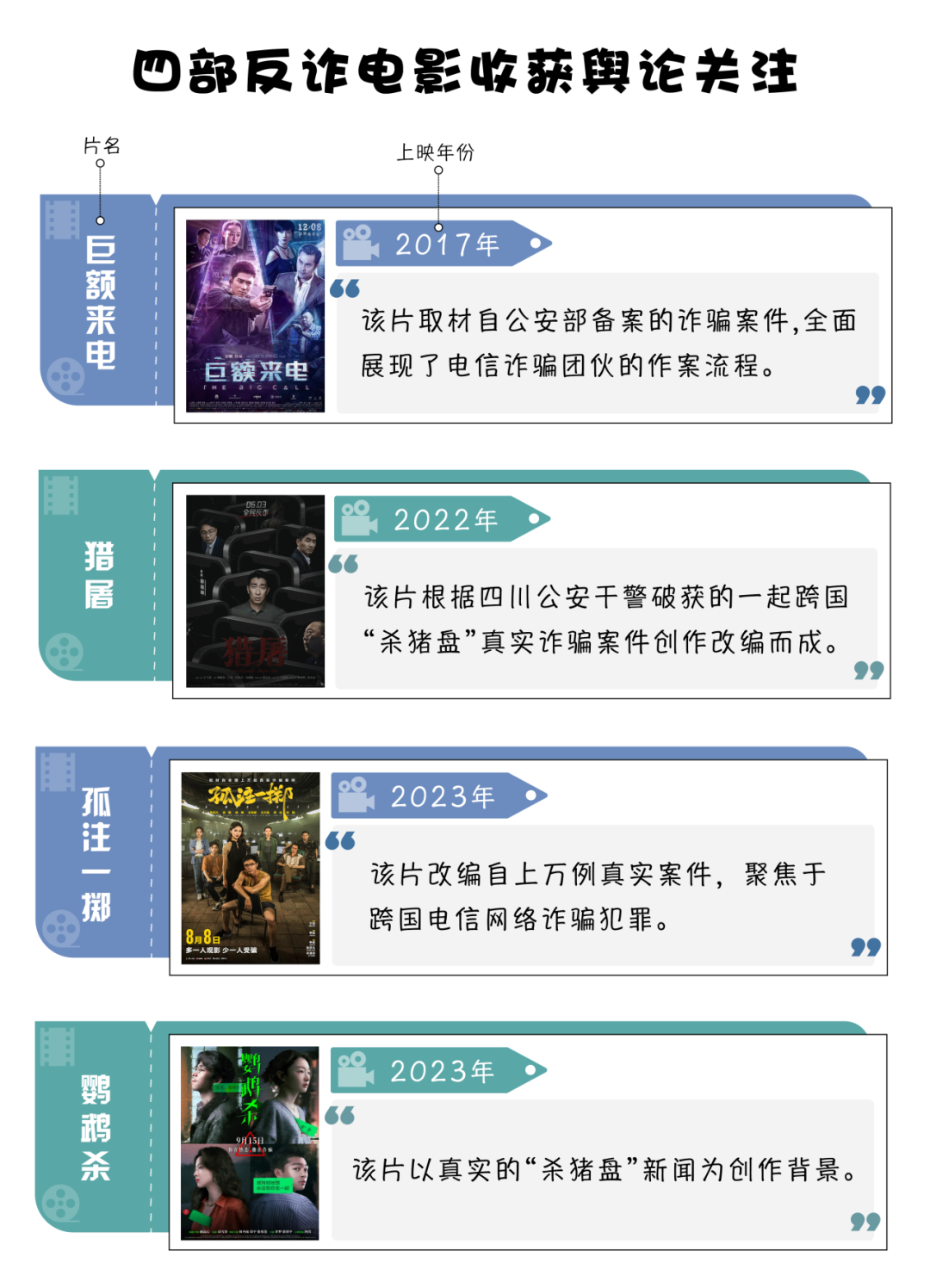 四部反電詐電影中,上映時間最早的是《巨額來電》,上映時間為2017年底,可以算作反電詐電影中的“前輩”。2022年5月10日,中宣部、公安部聯(lián)合啟動“全民反詐在行動”集中宣傳月活動,同年8月《獵屠》上映。2023年,公安機關(guān)對打擊電信網(wǎng)絡(luò)詐騙犯罪的力度不斷加大,宣傳力度隨之加強,《孤注一擲》《鸚鵡殺》等兩部電影上映,引發(fā)輿論熱烈反響。以上四部電影均取材于真實案例,讓觀眾真實了解電信網(wǎng)絡(luò)詐騙的危害,進(jìn)而提升自身防范意識。