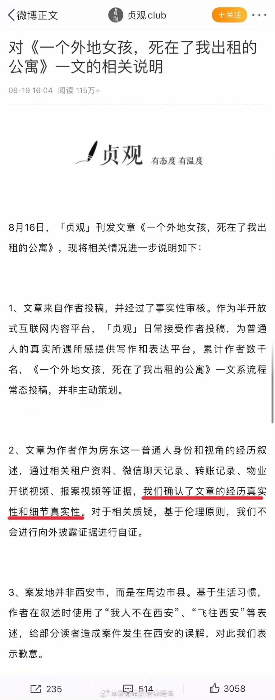 8月16日,微信公眾號(hào)“貞觀”發(fā)布一篇作者為“十二橡樹”的文章《一個(gè)外地女孩死在了我出租的公寓》。文章稱,今年4月,一名來自寧夏西海固山區(qū)的女孩租住了作者的單身公寓,她畢業(yè)于北京211高校,職業(yè)為會(huì)計(jì),當(dāng)時(shí)正在陜西西安找工作。女孩畢業(yè)后一心考公,多次取得家鄉(xiāng)省份事業(yè)單位筆試第一的成績(jī),卻一次次在面試環(huán)節(jié)落榜。6月25日,有人發(fā)現(xiàn)女孩疑似餓死在出租屋內(nèi),警方已介入處理。8月18日,“貞觀”以保護(hù)當(dāng)事人為由刪除該文章,并回應(yīng)稱文中所述為真實(shí)事件。8月19日,“貞觀”再次回應(yīng)稱文章來自作者投稿,經(jīng)過事實(shí)性審核,但案發(fā)地并非西安市,而是在周邊市縣。相關(guān)文章在社交平臺(tái)上引起熱傳,輿論呈現(xiàn)兩極分化:部分網(wǎng)民表示震驚和悲涼,借此對(duì)社會(huì)表達(dá)不滿;部分網(wǎng)民則對(duì)文內(nèi)相關(guān)細(xì)節(jié)的真實(shí)性提出疑問。