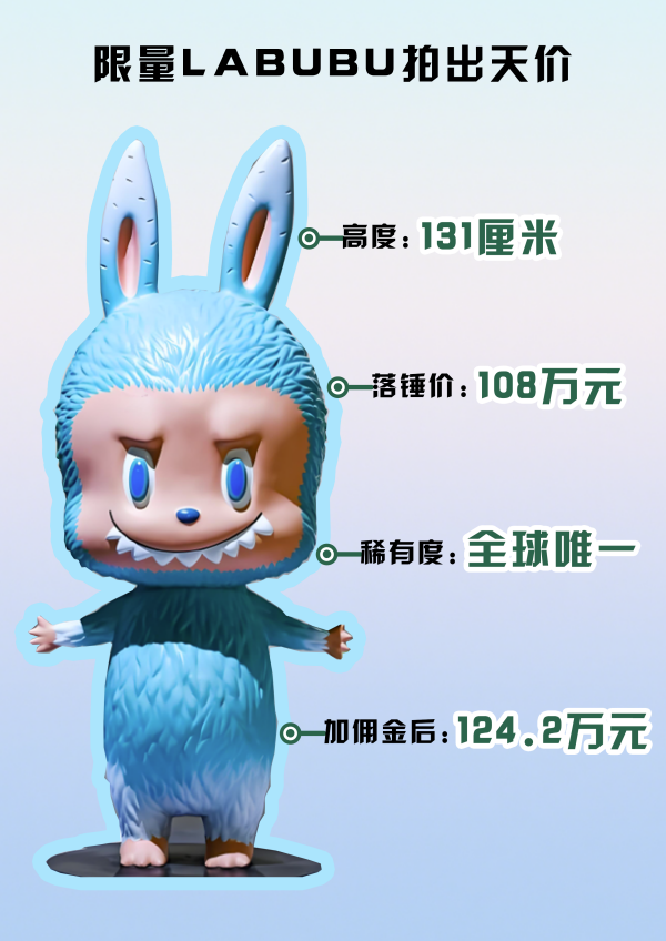 2025年6月10日,一件高131厘米的薄荷色初代LABUBU,以108萬(wàn)元的價(jià)格落槌成交,創(chuàng)造了最貴LABUBU記錄。