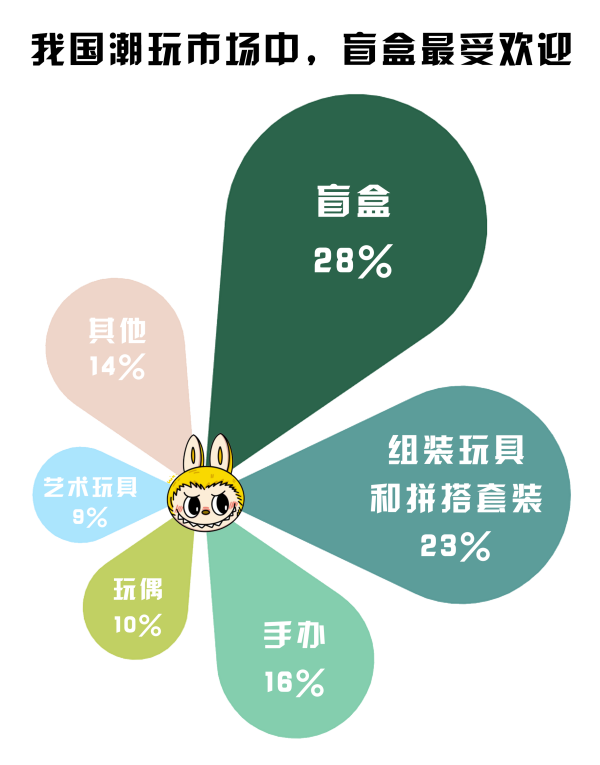 盲盒屬性為消費(fèi)者提供情緒價(jià)值。數(shù)據(jù)顯示,我國(guó)潮玩市場(chǎng)中,盲盒是最大的細(xì)分市場(chǎng),占比約28%。