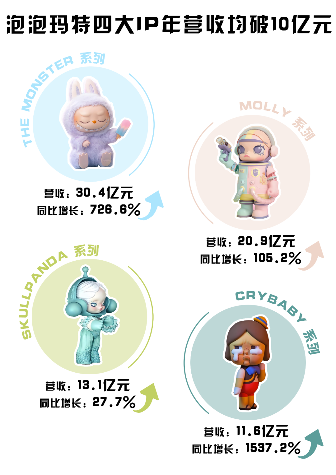 2025年4月,泡泡瑪特發(fā)布2024年報(bào)。報(bào)告顯示,2024年泡泡瑪特營(yíng)收約130.4億元。其中,四大IP“THE MONSTERS”“MOLLY”“SKULLPANDA”“CRYBABY”的營(yíng)收均突破10億元。LABUBU所屬的“THE MONSTERS”系列更是以30.4億元的營(yíng)收額,726.6%的同比增幅,當(dāng)之無(wú)愧成為泡泡瑪特旗下的第一IP。