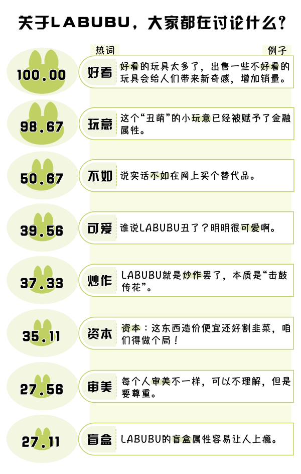 (數(shù)據(jù)來(lái)源:選取嗶哩嗶哩視頻《“丑東西”LABUBU,憑什么能讓全球富婆們上癮?》下的2976條一級(jí)評(píng)論及彈幕,做分詞及歸一化處理,進(jìn)行分詞后將熱度最高的詞語(yǔ)規(guī)定為100)