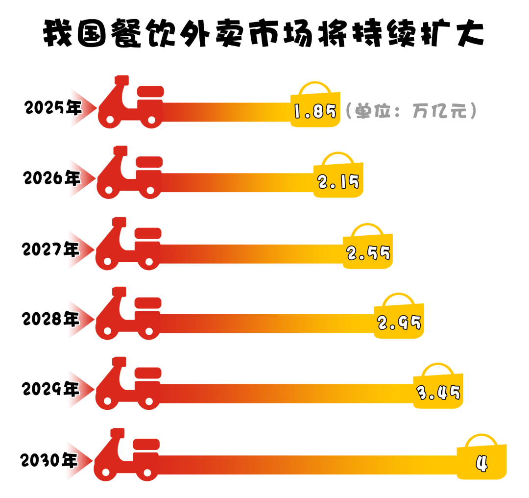 以外賣市場中的餐飲業(yè)為例,數(shù)據(jù)顯示,未來幾年,預(yù)計(jì)我國餐飲外賣市場規(guī)模將顯著增長,將從2025年的1.85萬億元一路攀升至2030年的4萬億元。這一持續(xù)拓寬的商業(yè)藍(lán)海,引得各家外賣平臺摩拳擦掌,“外賣大戰(zhàn)”不時(shí)打響。