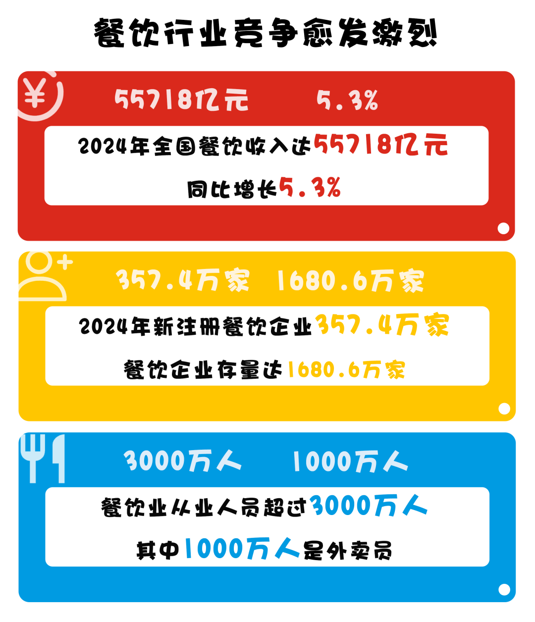 餐飲行業(yè)競爭激烈。數(shù)據(jù)顯示,截至2024年,我國餐飲企業(yè)數(shù)量已突破1680萬家,餐飲業(yè)從業(yè)人員超3000萬人,其中超1000萬人為外賣員。在此背景下,與外賣平臺合作成為不少商家順應(yīng)時(shí)代、立足行業(yè)的重要選擇。