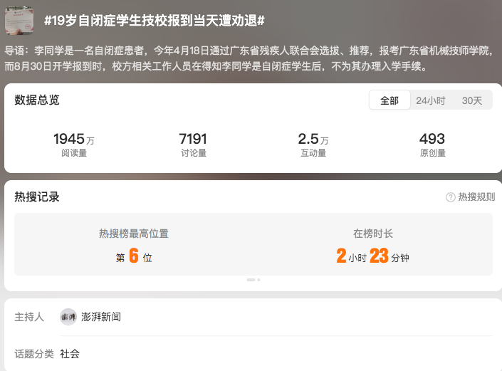 9月9日,澎湃新聞采訪相關(guān)方首發(fā)報(bào)道,當(dāng)事同學(xué)父親認(rèn)為,校方的審核、錄取程序存在諸多疏漏,直至入學(xué)報(bào)到當(dāng)天才說(shuō)不予接收,讓學(xué)生錯(cuò)失了報(bào)讀其他學(xué)校的機(jī)會(huì)。廣東省機(jī)械技師學(xué)院宣傳部相關(guān)負(fù)責(zé)人回應(yīng)稱(chēng),學(xué)校確實(shí)向該同學(xué)發(fā)放錄取通知書(shū),但該殘疾人招生項(xiàng)目主要面向肢體殘疾和言語(yǔ)殘疾學(xué)生,面試時(shí)校方教師對(duì)該同學(xué)患有自閉癥并不知情。因擔(dān)心對(duì)學(xué)校正常學(xué)生造成影響,建議其找其他合適的學(xué)校就讀。該報(bào)道發(fā)布后,齊魯晚報(bào)、上游新聞、極目新聞等媒體跟進(jìn)轉(zhuǎn)載,輿情開(kāi)始發(fā)酵,#19歲自閉癥學(xué)生技校報(bào)到當(dāng)天遭勸退#微博話題登上熱搜榜第6位。