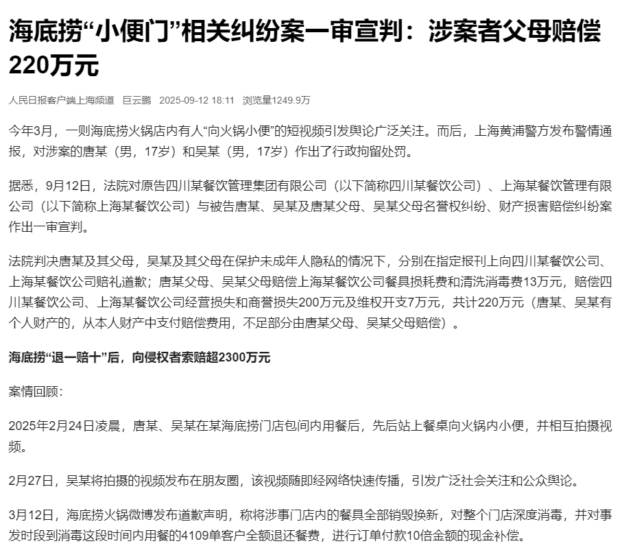 半年前引發(fā)廣泛討論的海底撈“小便門”事件近日迎來新進展。據(jù)人民日報客戶端報道,9月12日,上海市黃浦區(qū)人民法院對海底撈“小便門”相關(guān)糾紛案作出一審判決,肇事者唐某、吳某及各自父母在保護未成年人隱私的情況下,分別在指定報刊上賠禮道歉;賠償餐具損耗費和清洗消毒費13萬元、經(jīng)營損失和商譽損失200萬元及維權(quán)開支7萬元,共計220萬元,唐某、吳某有個人財產(chǎn)的,從本人財產(chǎn)中支付賠償費用,不足部分由唐某父母、吳某父母賠償。