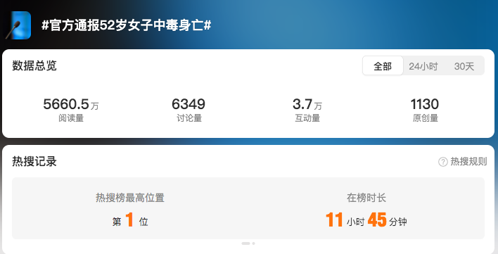 9月15日,浙江省杭州市余杭區(qū)閑林街道辦事處發(fā)布情況通報(bào)稱,9月9日,涂某某(女,52歲)在進(jìn)入閑林中路附近空地時(shí),不慎接觸廢棄氫氟酸中毒,送醫(yī)后經(jīng)搶救無效于2025年9月14日凌晨不幸身亡。公安機(jī)關(guān)在接警后第一時(shí)間介入調(diào)查;生態(tài)環(huán)境部門已按規(guī)范完成現(xiàn)場(chǎng)無害化處置;街道正在全力推進(jìn)善后處置工作。目前,事發(fā)原因正在進(jìn)一步調(diào)查中。當(dāng)晚“官方通報(bào)52歲女子中毒身亡”登上熱搜榜第一位,閱讀量迅速破千萬。