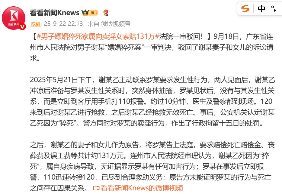 9月22日,據(jù)上海電視臺(tái)“@看看新聞Knews”消息,9月18日,廣東省連州市人民法院對(duì)男子謝某“嫖娼猝死案”作出一審判決。裁判文書(shū)網(wǎng)顯示,5月21日,謝某主動(dòng)聯(lián)系羅某要求發(fā)生性行為,兩人見(jiàn)面后,謝某沖涼后準(zhǔn)備發(fā)生性關(guān)系時(shí)突然身體抽搐,羅某見(jiàn)狀后,立即到客廳撥打110報(bào)警。醫(yī)護(hù)人員趕到后對(duì)謝某進(jìn)行搶救,謝某經(jīng)搶救無(wú)效死亡。警方認(rèn)定謝某死因?yàn)椤扳馈保瑢?duì)羅某的賣淫行為,作出行政拘留十五日的處罰。事后,謝某的妻子和女兒將羅某告上法庭,要求賠償死亡賠償金、喪葬費(fèi)及誤工費(fèi)等共計(jì)約131萬(wàn)元。連州市人民法院經(jīng)審理認(rèn)為,謝某死因?yàn)椤扳馈?,屬自身疾病?dǎo)致,無(wú)證據(jù)顯示羅某有任何加害行為;羅某在事發(fā)后當(dāng)即報(bào)警并配合120搶救,已盡到合理救助義務(wù);原告方未能證明羅某的行為與死亡之間存在因果關(guān)系。據(jù)此,該法院駁回謝某妻子和女兒的全部訴訟請(qǐng)求。