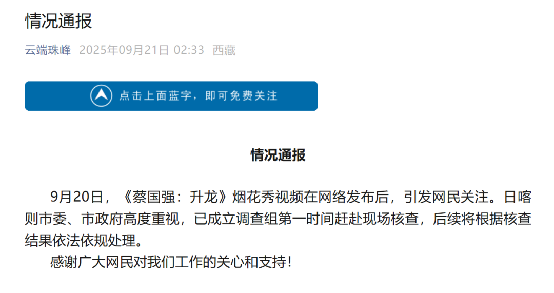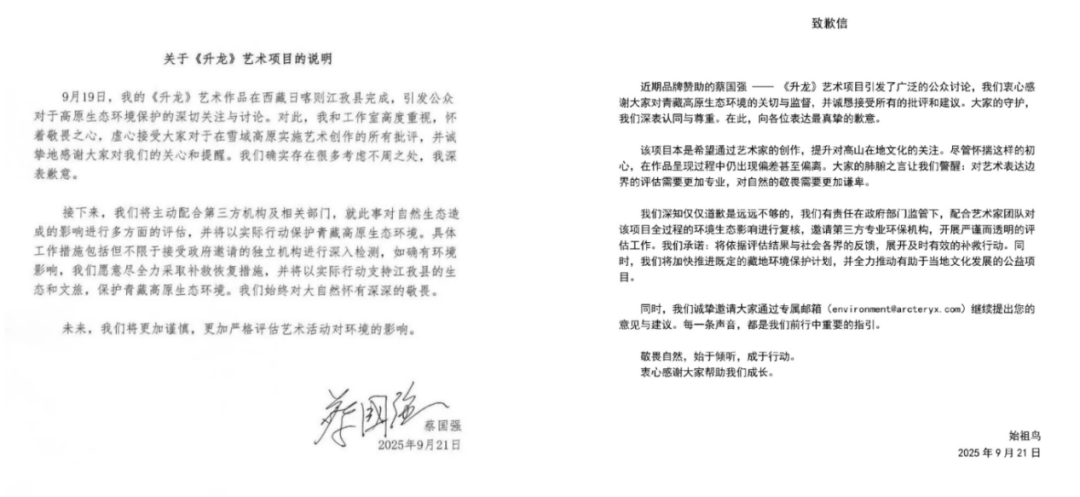 21日凌晨,日喀則市互聯(lián)網(wǎng)信息辦公室發(fā)布情況通報(bào)稱,日喀則市委、市政府已成立調(diào)查組第一時(shí)間趕赴現(xiàn)場核查,后續(xù)將根據(jù)核查結(jié)果依法依規(guī)處理。當(dāng)日,蔡國強(qiáng)工作室、始祖鳥分別發(fā)布致歉說明,蔡國強(qiáng)表示將“盡全力采取補(bǔ)救恢復(fù)措施”,始祖鳥則稱將邀第三方評估并依結(jié)果補(bǔ)救,同時(shí)推進(jìn)藏地環(huán)保計(jì)劃與文化公益項(xiàng)目。