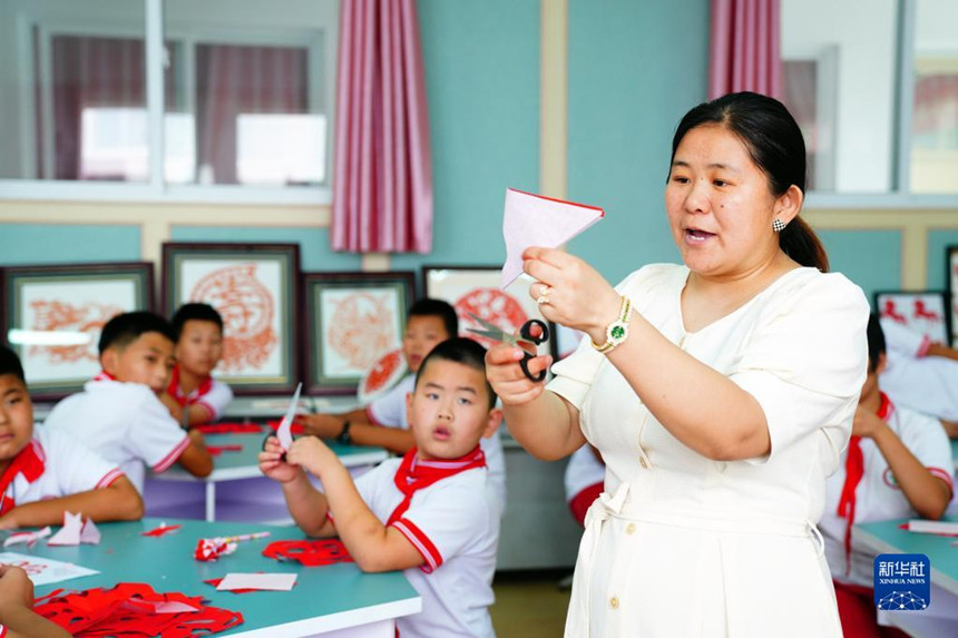 7月28日,在山東省齊河縣祝阿鎮(zhèn)馬坊社區(qū)鄉(xiāng)村“復(fù)興少年宮”,孫春華在教小朋友剪紙。