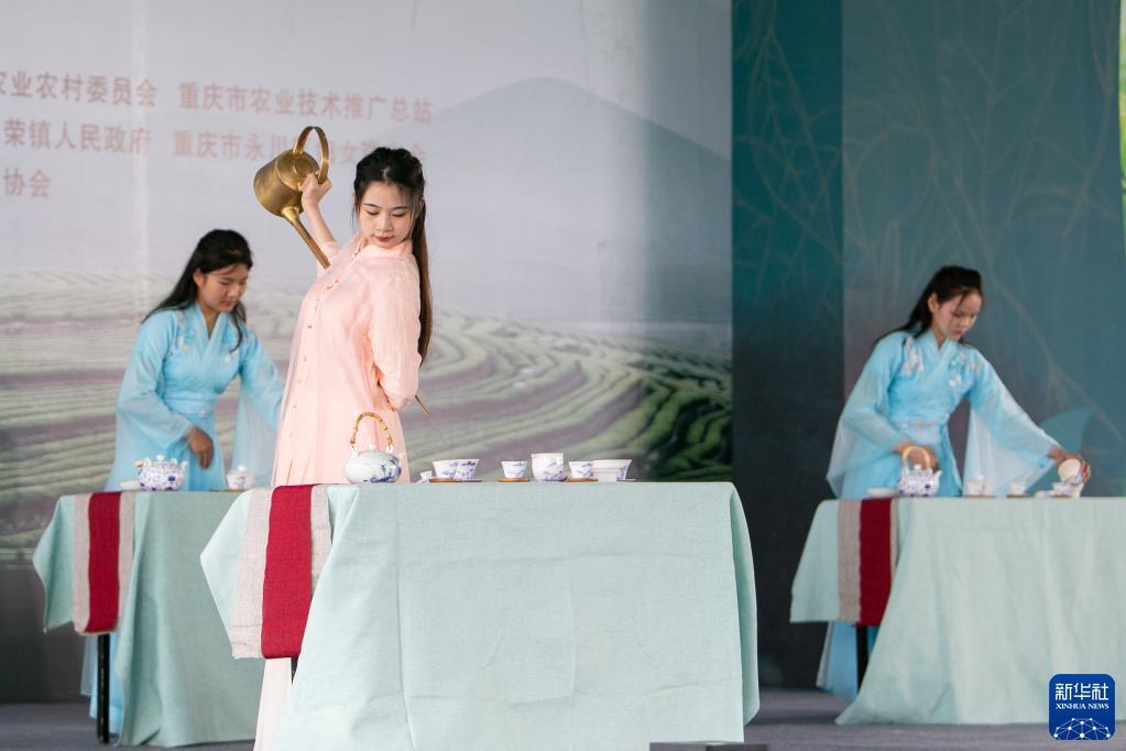 3月22日,在重慶市永川區(qū)永榮鎮(zhèn)鄉(xiāng)村振興就業(yè)園,演藝人員在表演茶藝。記者 儲(chǔ)加音 攝