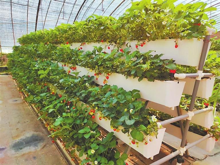 “我這一畝三分地一年產(chǎn)量在5000斤以上?!敝苊髁琳f,現(xiàn)在溫室大棚里的草莓種植都采用A字高架,在水肥一體化和膜下滴灌技術(shù)的加持下,產(chǎn)量比傳統(tǒng)的地壟栽培多了四成左右。