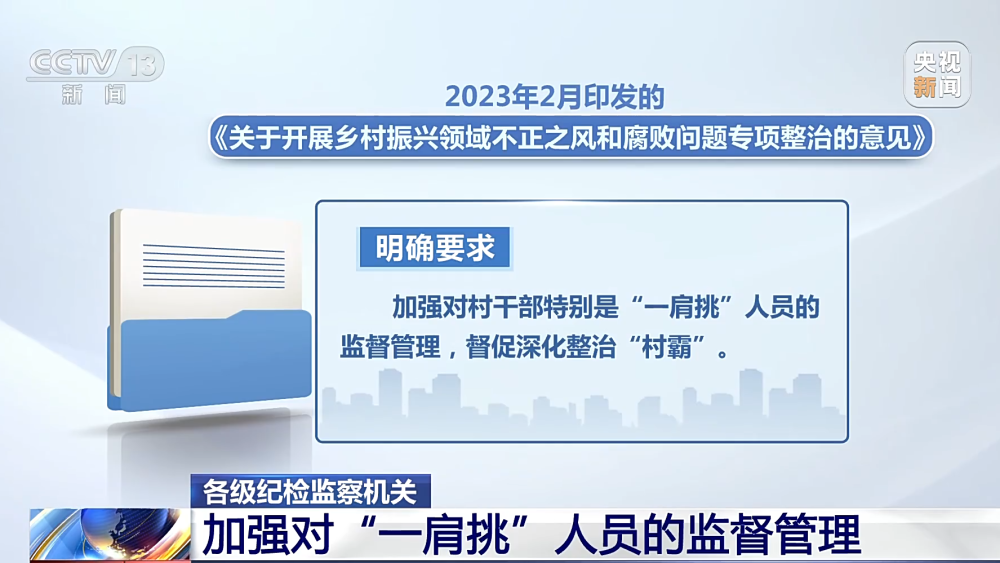今年2月印發(fā)的《關(guān)于開展鄉(xiāng)村振興領(lǐng)域不正之風(fēng)和腐敗問題專項整治的意見》就明確要求,加強(qiáng)對村干部特別是“一肩挑”人員的監(jiān)督管理,督促深化整治“村霸”。