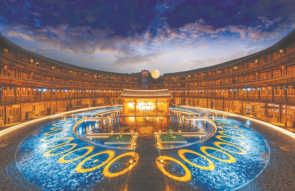 “古”是土樓的外在,“住”是土樓的內核。永定還打造了獨特的土樓民宿群。目前完成了南江村朝陽樓、東昌樓、洪坑村昇恒樓、南江村南興樓、新南村長源樓等民宿改造。民宿房間保留了土樓裸露的墻面,傳統(tǒng)農耕器具的布置也融合了耕讀文化與現(xiàn)代藝術,住客能親手觸碰建筑肌理,體驗濃厚的鄉(xiāng)村文化。