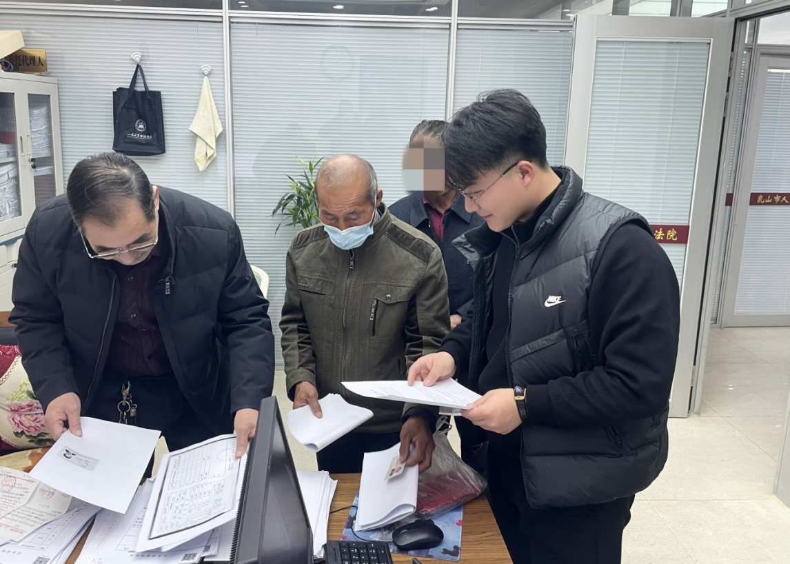 在市人民法院立案庭一線跟班學(xué)習(xí)鍛煉的乳山市委政法委王鑫源(右一)