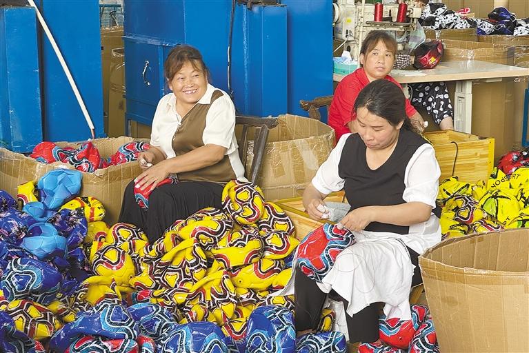 7月4日,在陜西省安康市漢陰縣平梁鎮(zhèn)興隆佳苑社區(qū)工廠,50多名女工緊張忙碌著。經(jīng)過裁剪、縫制、檢測等一道道工序,5000個(gè)足球下線,從大山深處走向市場。