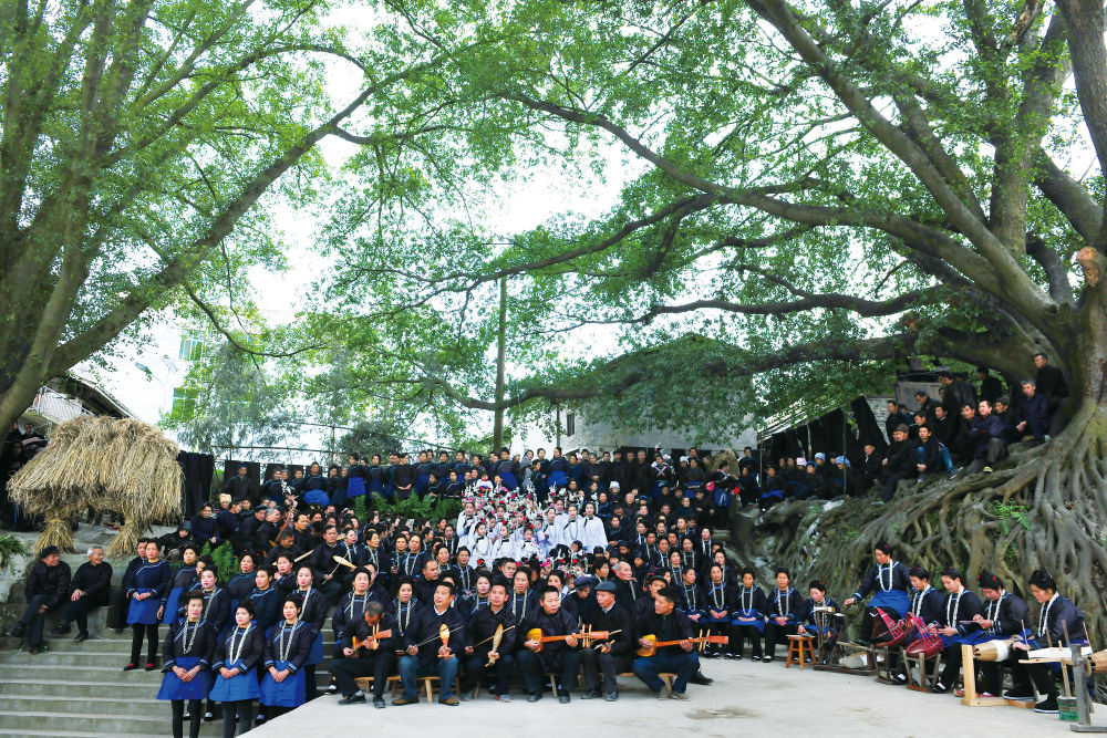 樂鄉(xiāng)侗寨的古榕樹下,400余名男女歌手匯聚一堂,歌唱著侗家牛腿琴歌 吳江平 攝