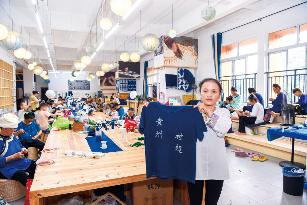 2023年5月貴州村超開賽后,現(xiàn)場(chǎng)數(shù)萬群眾踴躍參與的熱情、場(chǎng)內(nèi)外豐富瑰麗的非遺展演,讓這項(xiàng)村級(jí)賽事迅速在全網(wǎng)發(fā)酵。村超爆紅,讓貴州多彩民族文化“被看見”,更帶動(dòng)了當(dāng)?shù)靥厣椀仁止に嚻贰俺鋈Α保沤逭镆酝x閑在家、照看孫輩的嬢嬢們,因此有了在家門口、江水邊、榕樹下發(fā)揮特長(zhǎng)就業(yè)創(chuàng)收的機(jī)會(huì)。