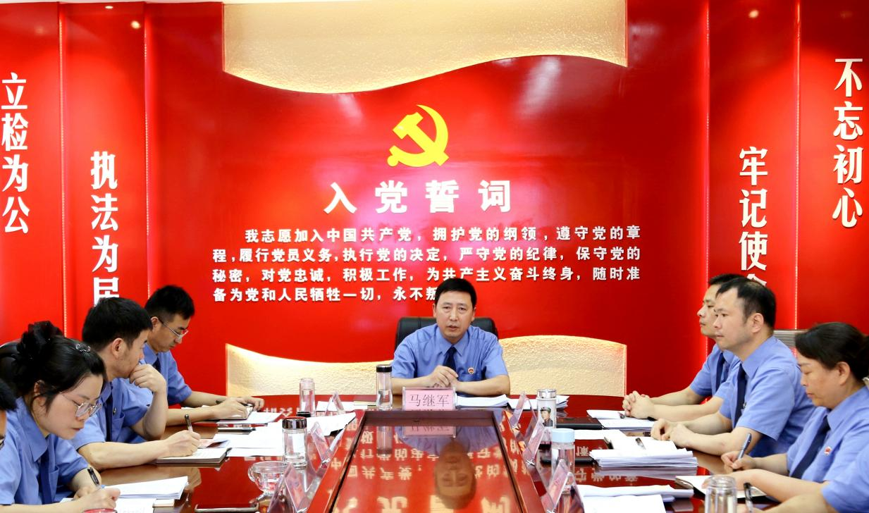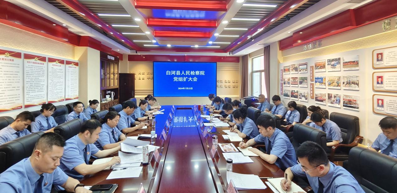 7月22日,陜西省安康市白河縣人民檢察院召開黨組擴大會,傳達學習黨的二十屆三中全會精神,研究部署當前重點工作,會議由該院黨組書記、檢察長馬繼軍主持,全體干警及書記員參加。