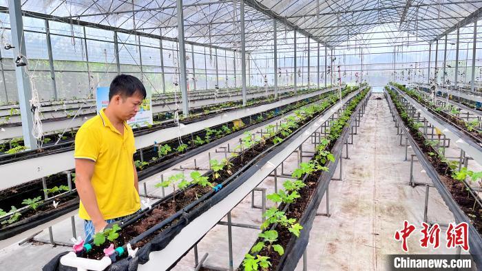 楊廣鋒在育苗大棚查看幼苗生長(zhǎng)狀況(臺(tái)山市農(nóng)業(yè)農(nóng)村局供圖)