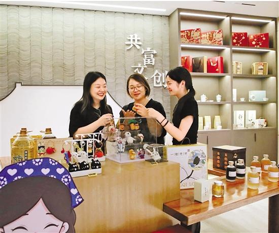 記者(左)與塘棲村鄉(xiāng)村CEO沈燕芬等人一起探討枇杷文創(chuàng)產(chǎn)品開發(fā) 丁華芳 攝