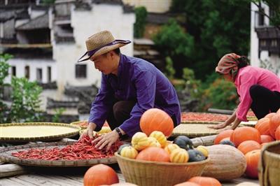 穿上傳統(tǒng)的農(nóng)民服飾,吳仙鳳每天用農(nóng)作物作畫,為游客表演篩辣椒、晾南瓜,這取代務農(nóng)成了她的主業(yè),隨著越來越多的游客來到篁嶺,吳仙鳳的收入也越來越高。