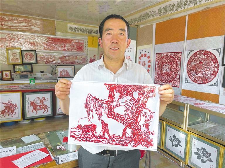 剪紙藝人楊國權(quán)展示作品《農(nóng)耕圖》