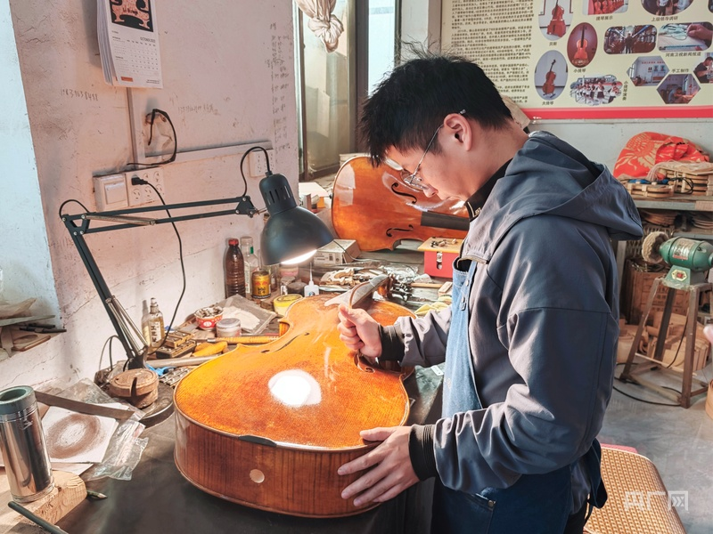 確山縣手工提琴制作協(xié)會會長王金堂見證了家鄉(xiāng)提琴產(chǎn)業(yè)從無到有、從弱到強(qiáng)的全過程。2015年,他率先返鄉(xiāng)創(chuàng)立河南省金鳴樂器股份有限公司,并帶領(lǐng)一批制琴師回到確山創(chuàng)業(yè)。他們通過改進(jìn)工藝、研發(fā)新品,將確山提琴打造成國際高端市場的寵兒。王金堂介紹,他的一把定制手工提琴曾以20萬美元的價(jià)格賣出。
