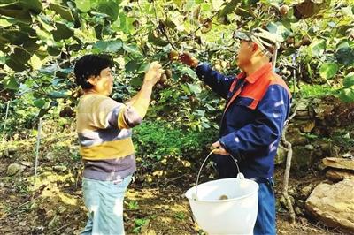 劉樹(shù)成和妻子采摘自家果園的獼猴桃