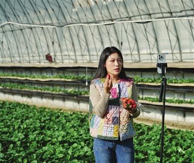 趙海秋正在自家草莓大棚錄制短視頻