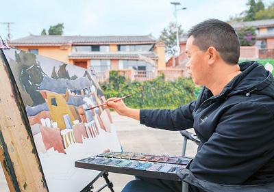一名繪畫(huà)愛(ài)好者在土瓜沖村寫(xiě)生 記者 王靜頤 攝