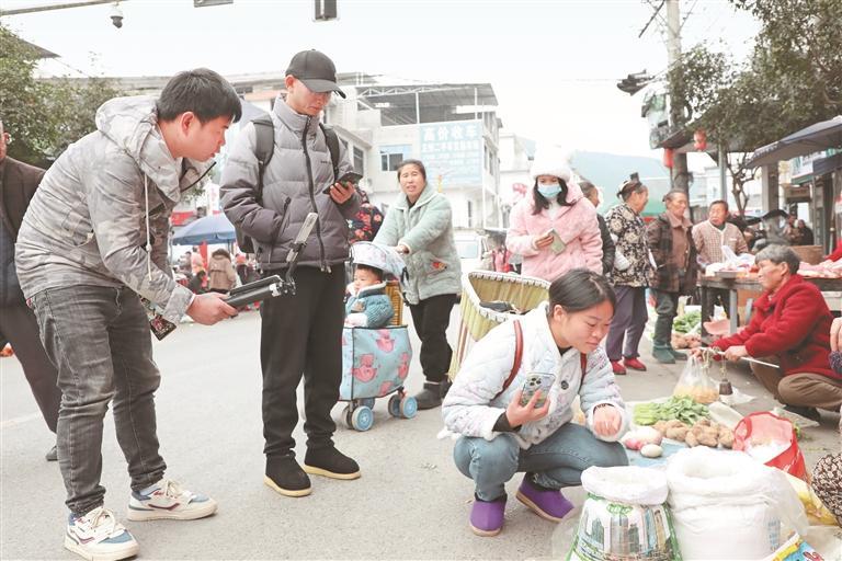 人群中,“鄉(xiāng)村琴妹”村播團(tuán)隊(duì)引人注目。他們分工明確,一個(gè)負(fù)責(zé)解說,一個(gè)負(fù)責(zé)跟拍,還有一個(gè)負(fù)責(zé)上鏈接。