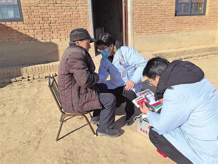 2月5日,賈永濤(中)和同事孫建成為小金街道欠灣村村民馬志明檢查身體 記者 蒲茜 攝