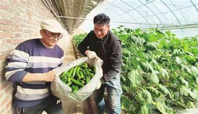 雙街果蔬采摘園內(nèi),工人們?cè)谑卟舜笈锢锾е鴦倓偛烧乃S瓜。照片由受訪單位提供