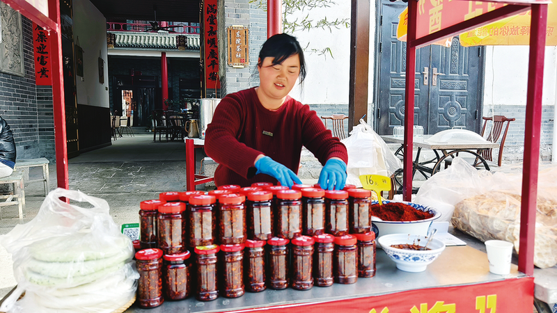 “現(xiàn)在真是大變樣!”鄭翠擦著餐桌感慨道,“我一個(gè)普通農(nóng)民,本是給孩子做的辣醬,竟然得到這么多人的認(rèn)可,這讓我非常開心?!?023年,村上免費(fèi)組織村民學(xué)習(xí)抖音短視頻拍攝,岳綿綿親自幫助她。鏡頭里既有辣子鍋盔的制作過(guò)程,也有青訓(xùn)班舊址的紅色故事。如今這家不足200平方米的農(nóng)家樂,自從“觸網(wǎng)”后,本著薄利多銷的原則,依靠品質(zhì)和服務(wù),游客翻了一番,自制辣醬年銷售額常常供不應(yīng)求。