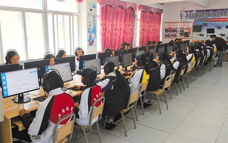 在日喀則市吉隆縣中學新機房內,學生們頭戴耳機跟隨教師指令進行實操訓練。