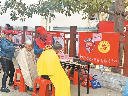 興龍街道平浪村志愿者服務(wù)隊(duì)在老區(qū)廣場開展愛心義剪。(長洲區(qū)融媒體中心供圖)