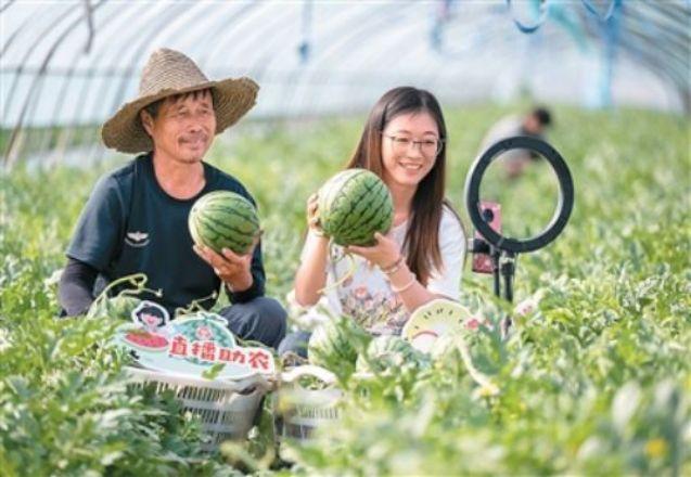 浙江省湖州市長(zhǎng)興縣濱湖村,年輕志愿者和瓜農(nóng)一起直播銷售今年首批大棚西瓜。譚云俸 攝